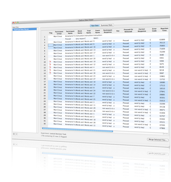 O SuperLab recolhe dados do tempo de reacção e grava-os como ficheiros de texto simples, com colunas separadas por tabulações. É fácil abrir esses ficheiros com programas como o Excel, mas para pré-visualizar os dados e suas estatísticas básicas, o aplicativo gratuito Cedrus Data Viewer é simplesmente imbatível: