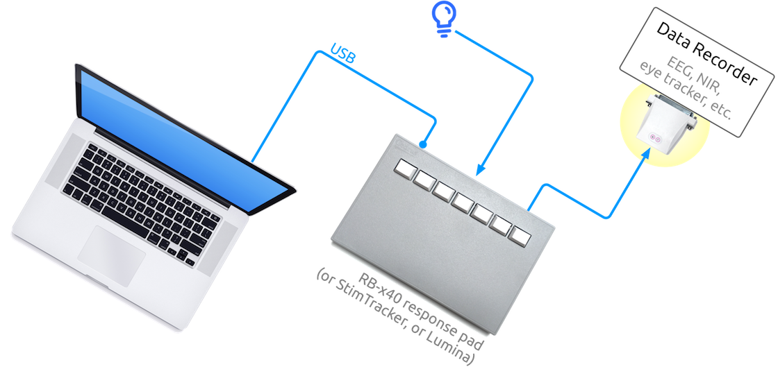 O m-pod é o principal elo entre os pads de resposta Lumina ou RB de um lado e o seu EEG ou eye tracker do outro. A sua operação é independente da conexão USB com o computador. Pode até usar o seu pad de respostas no modo de teclado menos preciso, mas ainda assim obter uma marcação de eventos muito precisa no seu dispositivo de gravação.