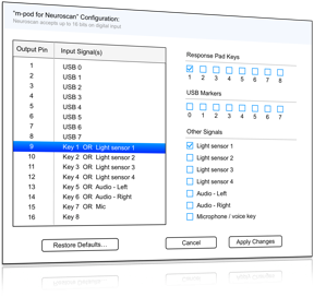 Obtenha todos ou apenas os sinais de que precisa. Em algumas experiências, pode marcar o início das teclas pressionadas pelos participantes. Noutras, esses marcadores atrapalham e são precisos mais bits de dados disponíveis para os marcadores que envia via USB. Ou talvez precise de uma mistura de ambos.